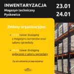Szanowni Państwo, informujemy, że w piątek 23 stycznia oraz sobotę 24 stycznia odbędzie się inwentaryzacja magazynu technicznego w Pyskowicach. W związku z nią: Przepraszamy za wszelkie niedogodności i dziękujemy za wyrozumiałość. Zapraszamy ponownie od poniedziałku! Zespół Polmarkus