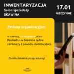 Szanowni Państwo, informujemy, że w sobotę, 17 stycznia, sklep Polmarkus w Skawinie będzie zamknięty z powodu inwentaryzacji. Przepraszamy za wszelkie niedogodności i dziękujemy za wyrozumiałość. Zapraszamy ponownie od poniedziałku! Zespół Polmarkus