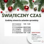 Informujemy o godzinach otwarcia naszych sklepów w okresie świątecznym: 20 grudnia (sobota): 21 grudnia (niedziela): 24 grudnia (Wigilia): 27 grudnia (sobota): 31 grudnia (Sylwester): Prosimy o wcześniejsze zaplanowanie zakupów i odbiorów.