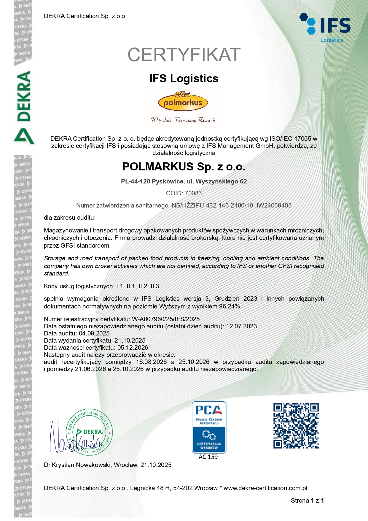 Ocenę przeprowadziła jednostka certyfikująca DEKRA Certification Sp. z o.o., a nasz wynik audytu to 96,24%, co odpowiada poziomowi „Wyższemu” zgodnie z wymaganiami IFS Logistics (wersja 3, grudzień 2023).