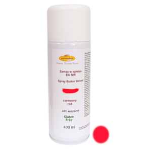 Zamsz spożywczy w kolorze czerwonym pozwalający na uzyskanie kolorowej powłoki zamszowej na zmrożonej lub schłodzonej powierzchni wyrobów cukierniczych typu ciast, tortów oraz figurek czy dekoracji wykonanych na bazie czekolady, marcepanu lub lukru. Produkt bezglutenowy.