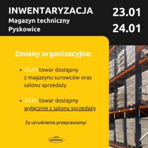 informujemy, że w piątek 23 stycznia oraz sobotę 24 stycznia odbędzie się inwentaryzacja magazynu technicznego w Pyskowicach.